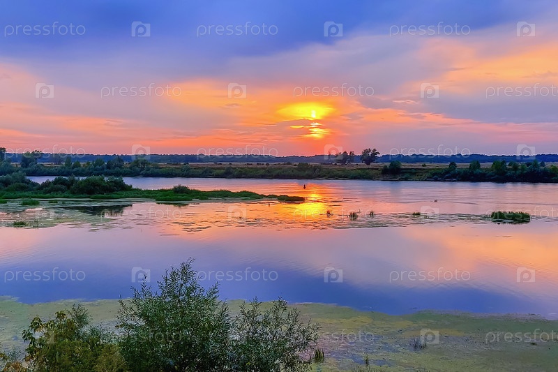Красивый и красочный заход солнца на реке с синим небом и ярко-оранжевым солнцем