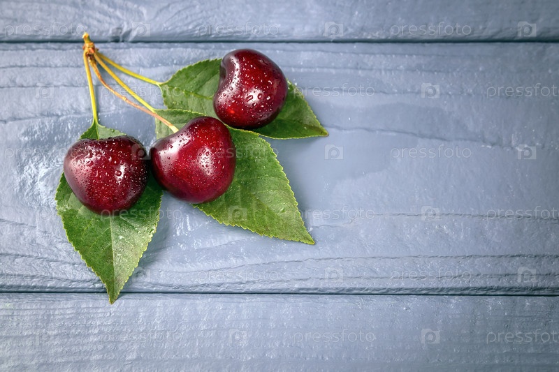 Вкусные и сочные ягоды вишни с зелеными листьями на сером деревянном столе