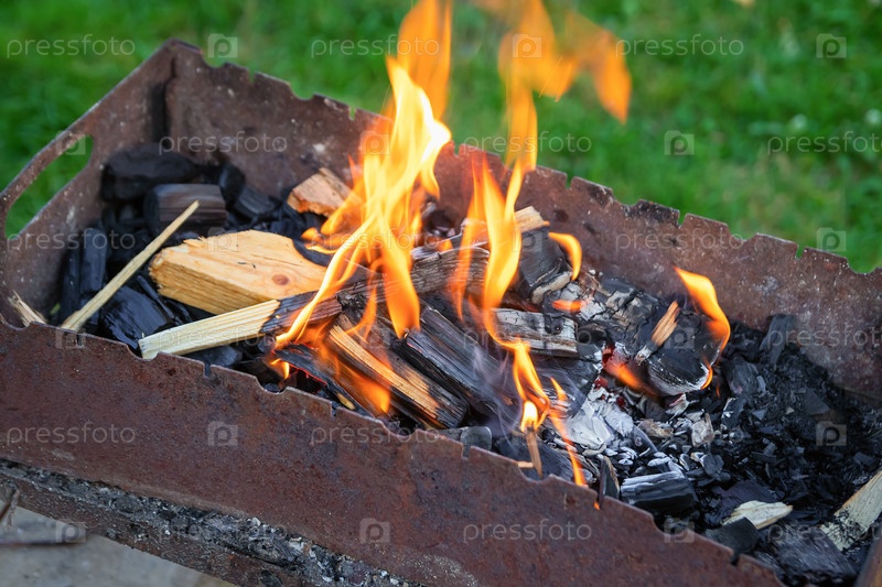 В гриле вспыхивает огонь. Отдых на природе, кемпинг, приготовление шашлыка