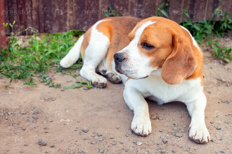 Портрет гончей собаки, лежащей на земле с грустной мордой. Домашнее животное ждет своего хозяина и грустит