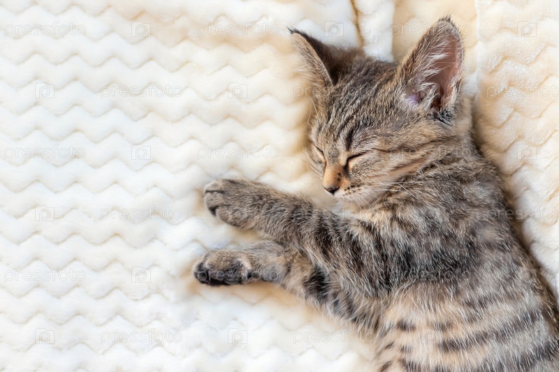 Симпатичный маленький серый полосатый котенок спит на кровати на теплом уютном бежевом одеяле. Концепция отдыха, релаксации, отпуска