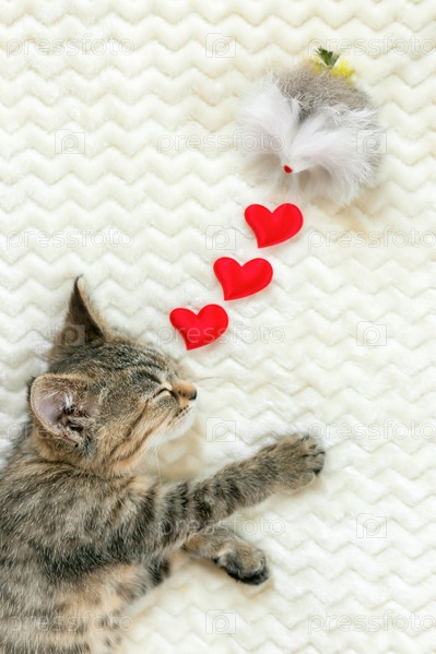 Симпатичный маленький котенок спит на кровати под теплым уютным бежевым одеялом с красными сердечками и игрушечной мышкой. Концепция мечтаний и желаний питомца