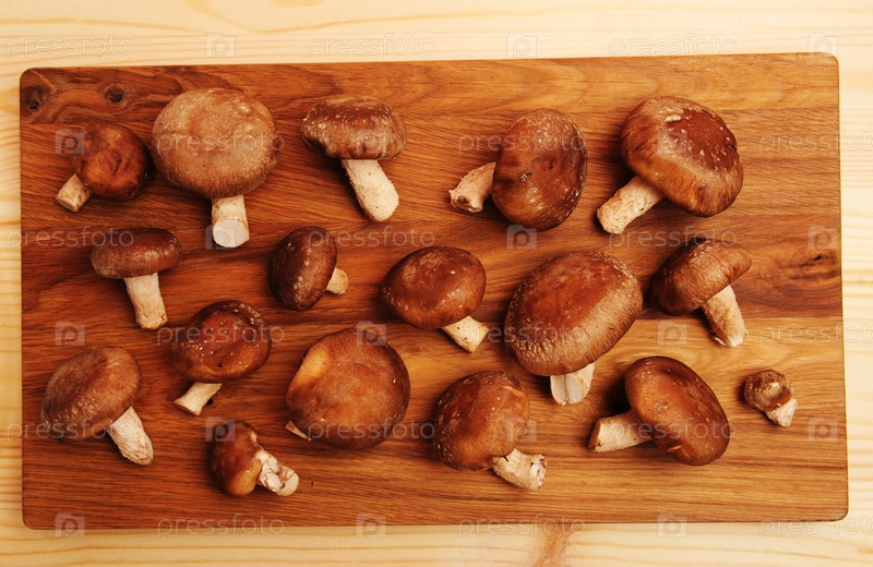 Сырые грибы шиитаке на деревянной доске, вид сверху