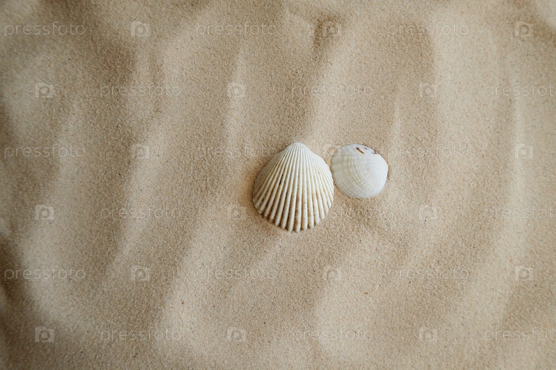 Ракушки на песчаном пляже. Летний фон. Путешествие в морские страны