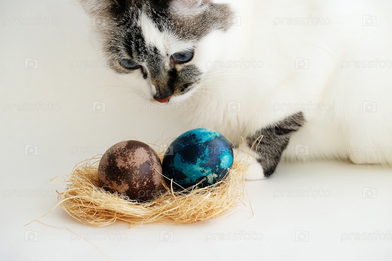 Красивая голубоглазая белая кошка с пасхальными яйцами в гнезде из кокосового волокна на белом фоне