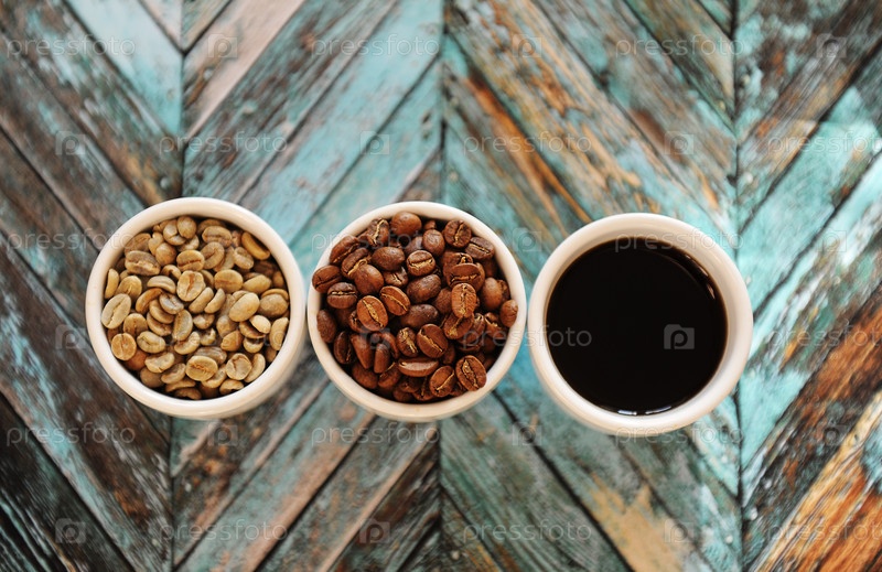 Зеленые сырые бобы, жареные кофейные зерна и черный кофе в трех белых чашках на бирюзовом деревянном фоне, вид сверху