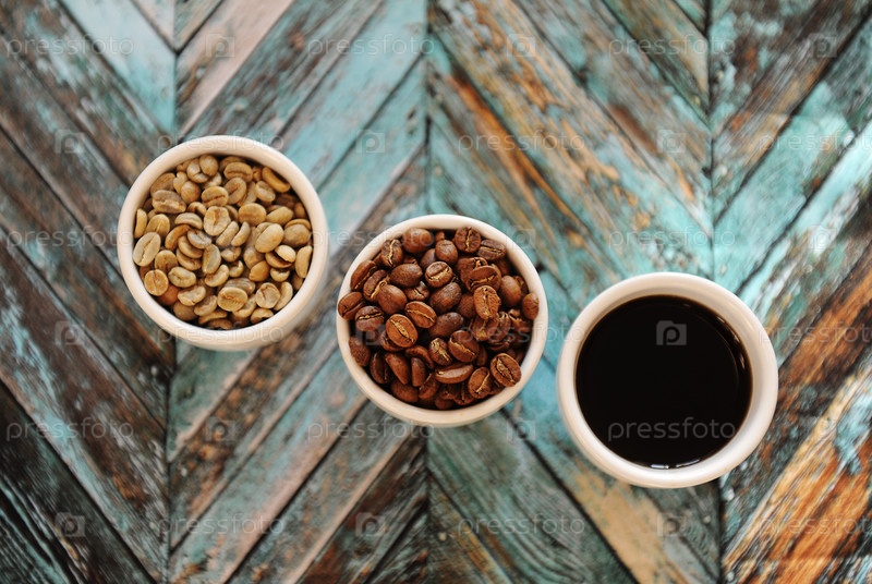 Зеленые сырые бобы, жареные кофейные зерна и черный кофе в трех белых чашках на бирюзовом деревянном фоне, вид сверху