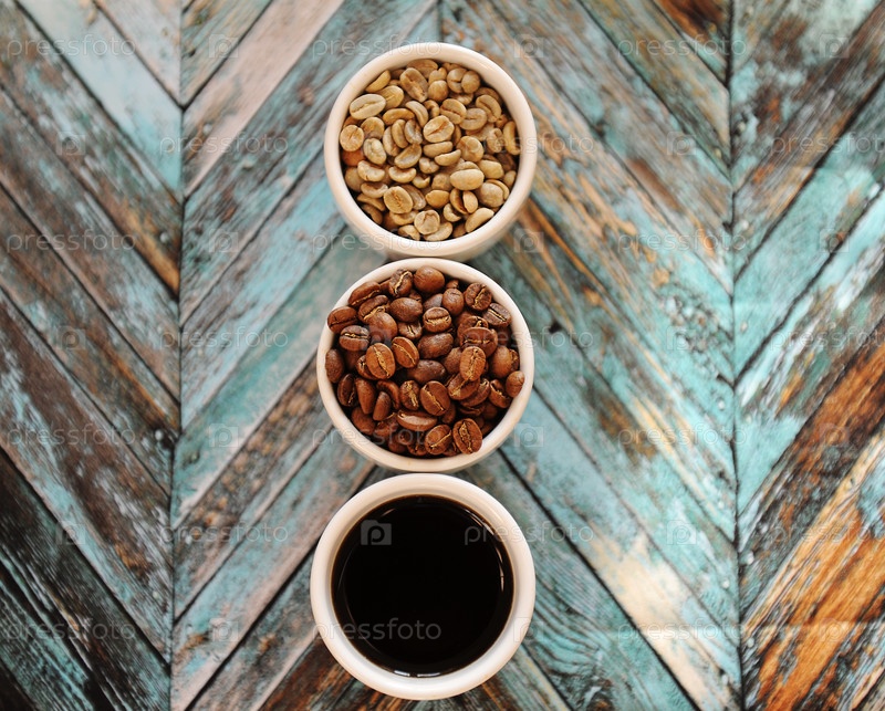 Зеленые сырые бобы, жареные кофейные зерна и черный кофе в трех белых чашках на бирюзовом деревянном фоне, вид сверху