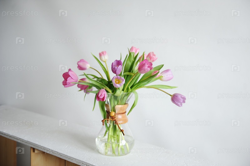 Букет тюльпанов цветов в графине кувшина кофе на белом столе в солнечном свете. Белый фон изолирован. Розовые и сиреневые бутоны