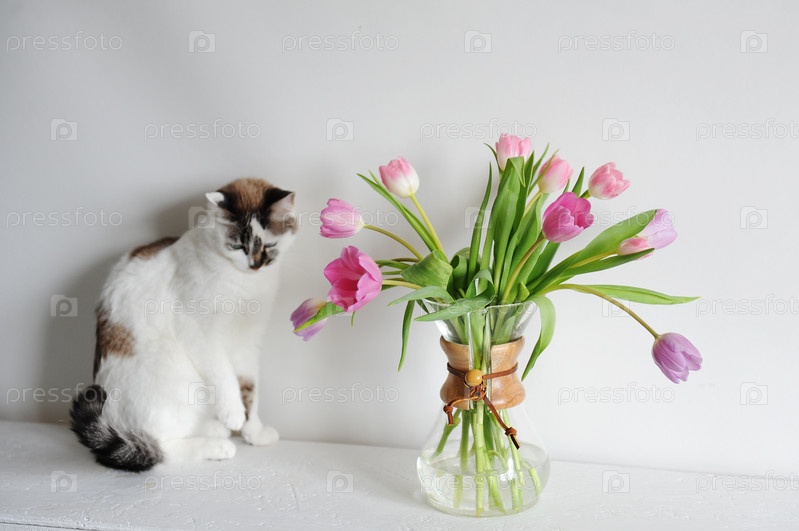 Милый белый пушистый кот и букет тюльпанов в кувшине графина кофе. Белый фон изолирован