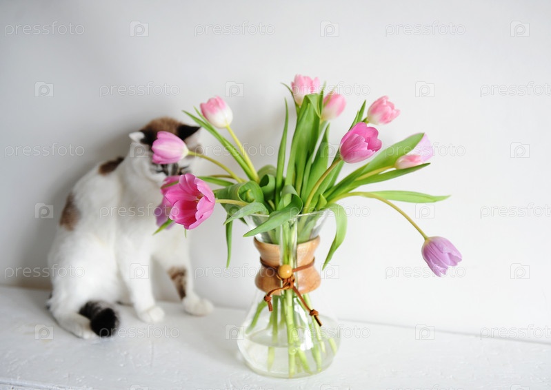 Милый белый пушистый кот и букет тюльпанов в кувшине графина кофе. Белый фон изолирован
