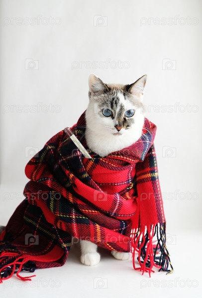 Милый бело-голубоглазый кот, завернутый в теплое одеяло, измеряет температуру медицинским термометром