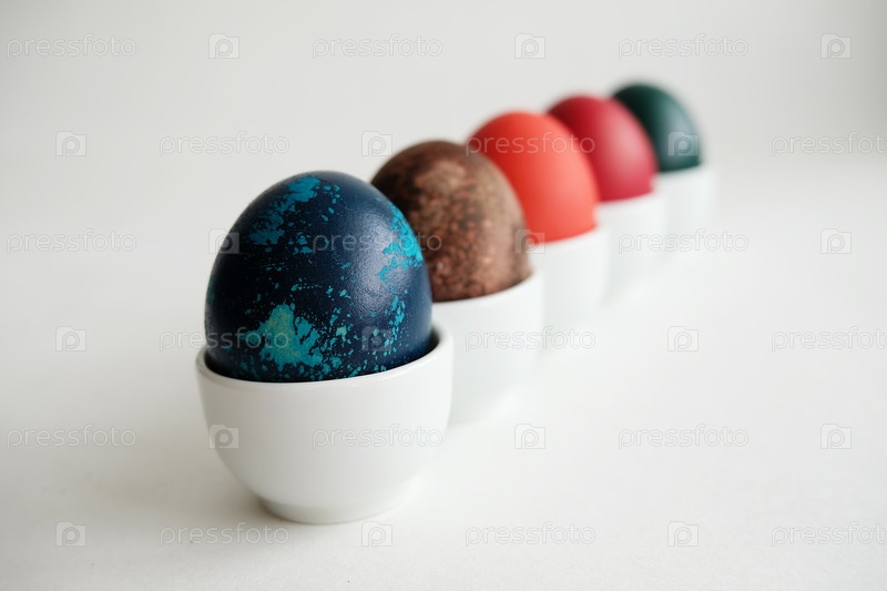 Пасхальные яйца на фарфоровых подставках на белом фоне