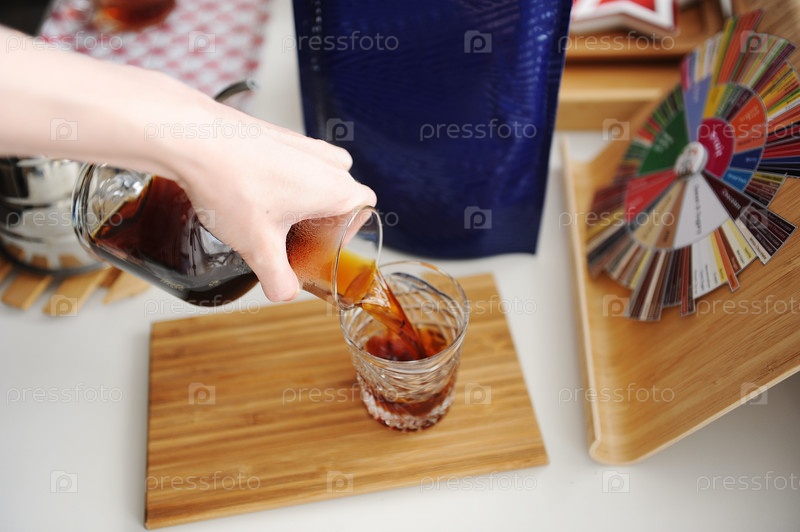 Ручной пивоваренный натюрморт. Лить фильтр кофе из стеклянного кувшина в чашку. Бамбуковая доска. Специализированная эстетика третьей волны