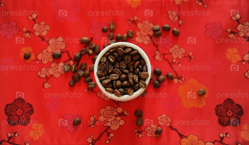 Концепция фирменного кофе в Китае. Жареная фасоль в белой чашке на красной ткани с традиционным китайским узором. Вид сверху