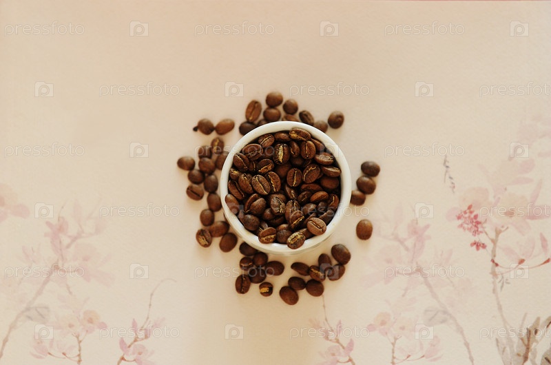 Концепция фирменного кофе в Китае. Жареная фасоль в белой чашке и на фоне традиционного китайского узора. Вид сверху