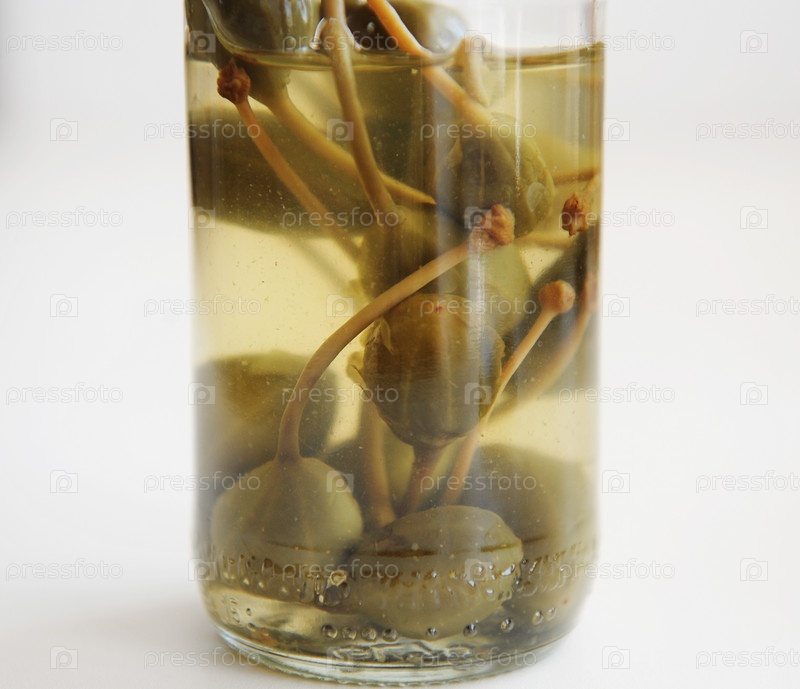 Маринованные каперсы в стеклянной банке крупным планом на белом фоне