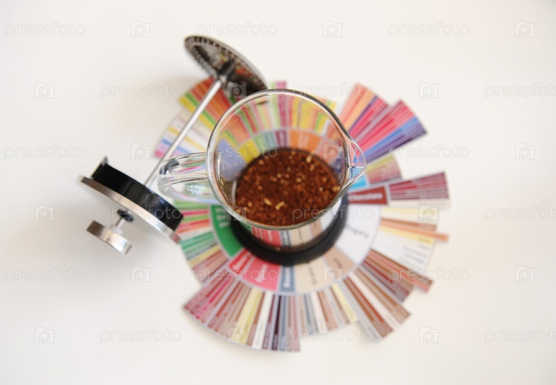 Френч-пресс с молотым кофе. На колесе ароматов дегустатора кофе. Вид сверху. белый фон