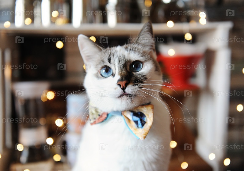 Красивый портрет белого голубоглазого пушистого кота в галстуке-бабочке. Фон размытых волшебных огней. Новогоднее настроение
