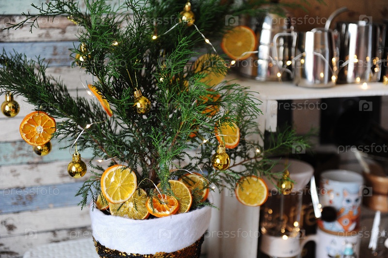 Маленький можжевельник в горшке. Украшен крошечными золотыми шариками, сушеными дольками цитрусовых и легкой гирляндой