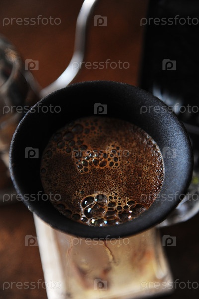 Кофе цветет в пористом керамическом безбумажном фильтре-капельнице. Закрыть. Альтернативное ручное пивоварение. Чайник "гусиная шея"