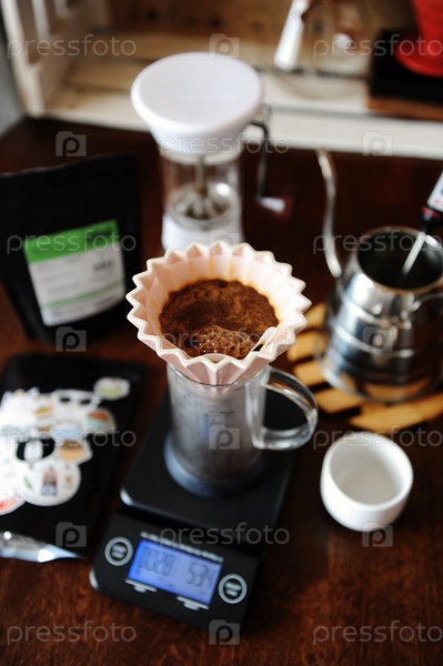 Цветущий кофе в розовой керамической капельнице оригами с бумажным фильтром. Альтернативное заваривание кофе. Ручная мясорубка. Чайник на гусиной шее. Электронные весы