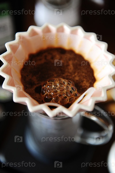 Цветущий кофе крупным планом в розовой керамической капельнице оригами с бумажным фильтром. Альтернативное ручное ручное пивоварение. Вид сверху