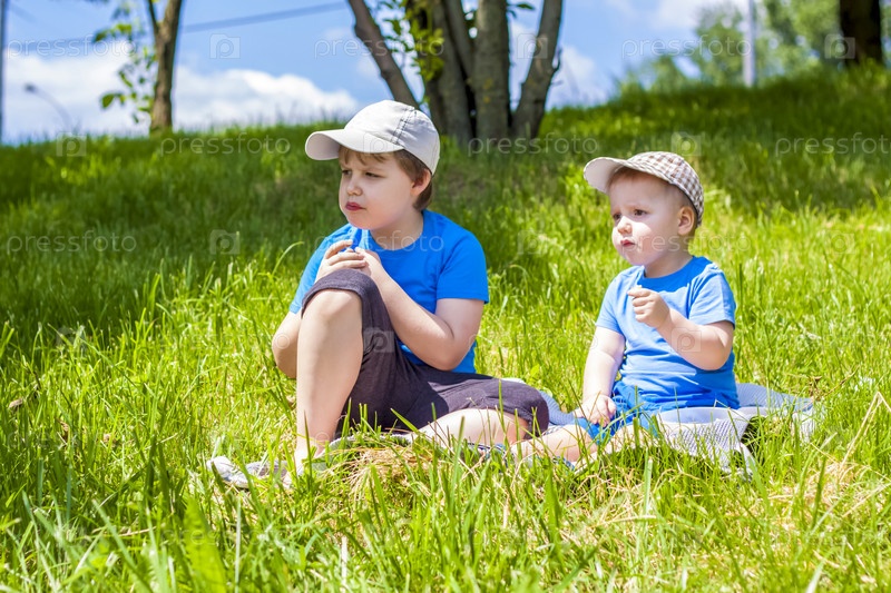 Лето и теплый день. Дети на пикнике сидят на одеяле и едят фрукты с тарелки. Живые эмоции ребят