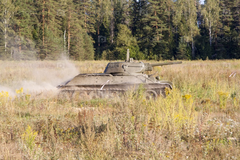 Москва, Россия, 2018-08-25, выставка военной техники, показ военной техники в действии. Военный танк в движении на фоне зеленых деревьев