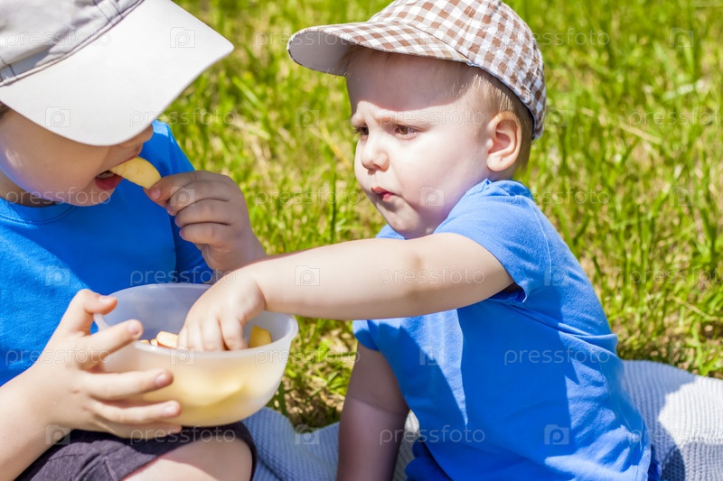 Лето и теплый день. Дети на пикнике сидят на одеяле и едят фрукты с тарелки. Живые эмоции ребят