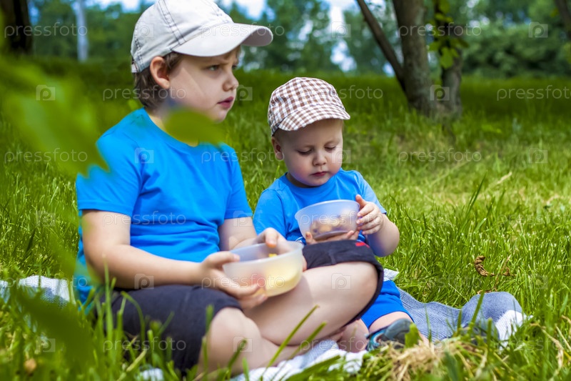 Лето и теплый день. Дети на пикнике сидят на одеяле и едят фрукты с тарелки. Живые эмоции ребят
