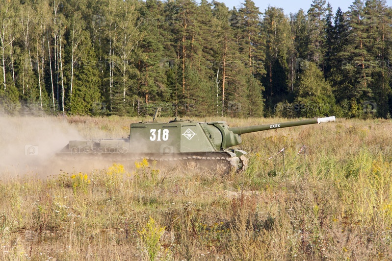 Москва, Россия, 2018-08-25, выставка военной техники, показ военной техники в действии. Военный танк в движении на фоне зеленых деревьев