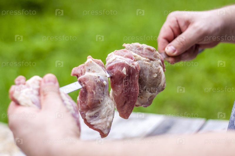 Сырое мясо для приготовления барбекю на костре. Традиционный кавказский шашлык на шампуре, приготовление мяса на шампурах. Шашлык жарится на мангале