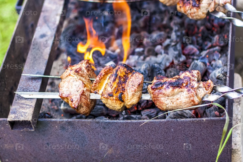 Приготовление шашлыка на костре. Традиционный кавказский шашлык на шампуре, приготовление мяса на шампурах