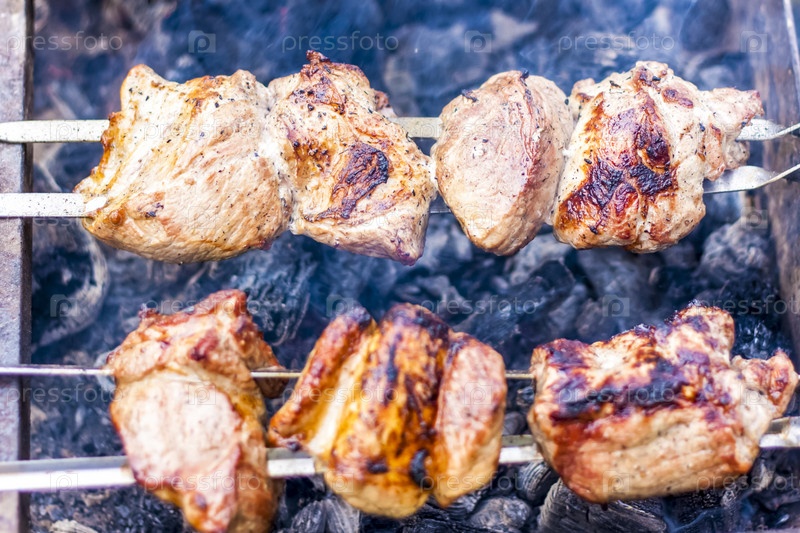 Приготовление шашлыка на костре. Традиционный кавказский шашлык на шампуре, приготовление мяса на шампурах