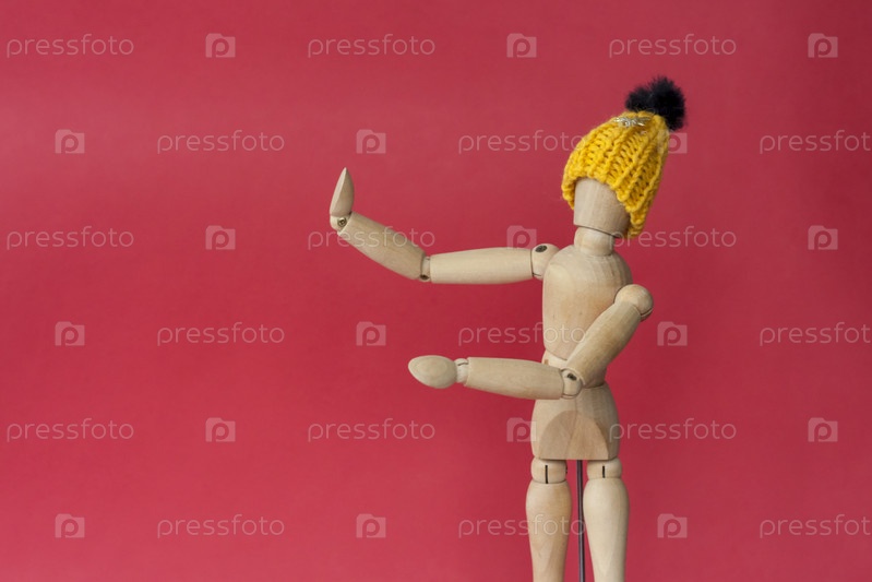 Деревянный манекен мужчины в вязаной желтой шапке указывает на место рядом с ним. Манекен мужчины из дерева на красном фоне