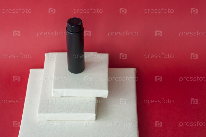Черные бутылки со сливками стоят на белых многоуровневых подставках. Черные бутылки на красном фоне. Уход за кожей, увлажняющий и питательный или солнцезащитный крем