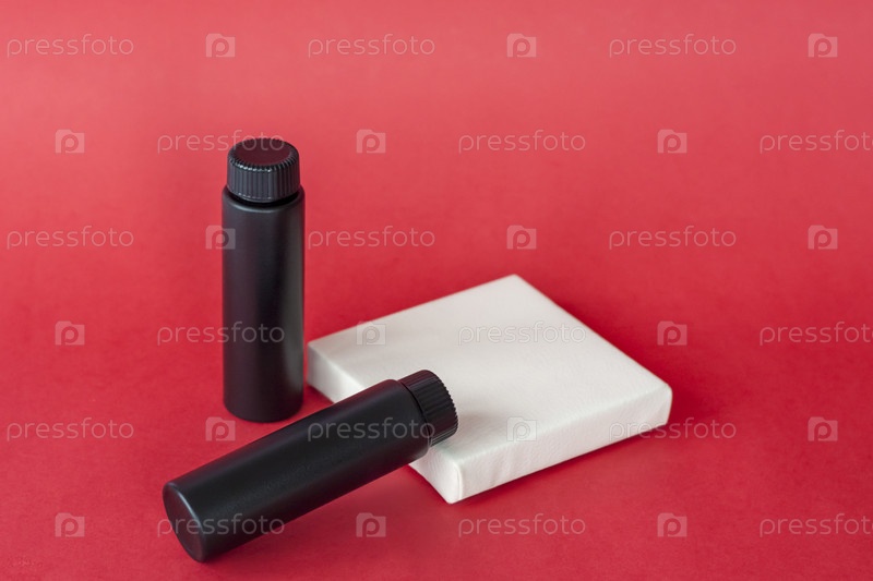 Флаконы черного крема на белой подставке. Черные бутылки на красном фоне. Уход за кожей, увлажняющий и питательный или солнцезащитный крем