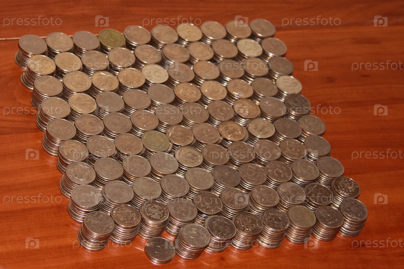 Москва, 15.10.2012, На столе аккуратными стопками лежат пятирублевые монеты