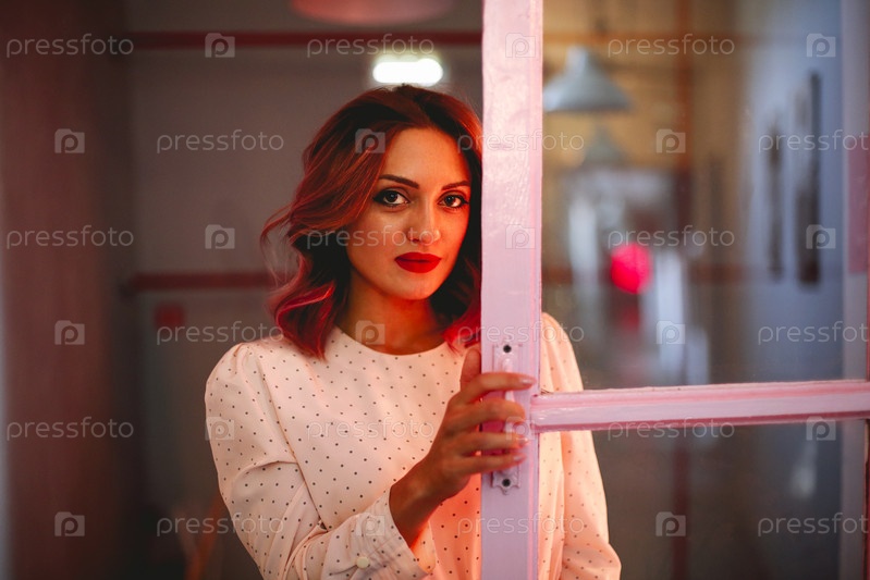 Спокойная женщина в комнате возле двери