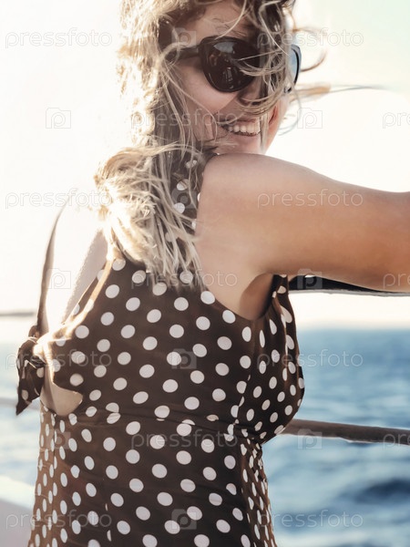 Беззаботная женщина на пирсе у моря