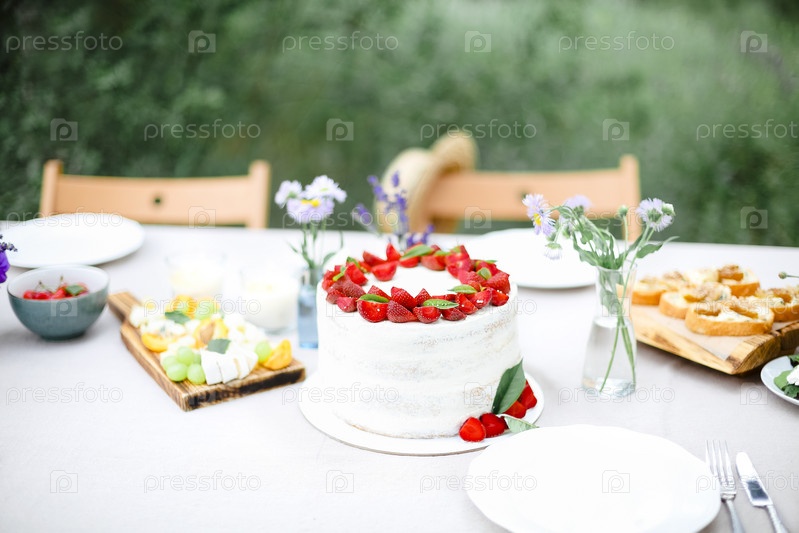 Торт на банкетном столе в саду