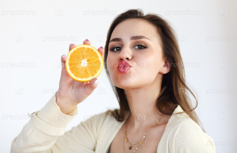 Молодая девушка держит спелый апельсин на светлом фоне