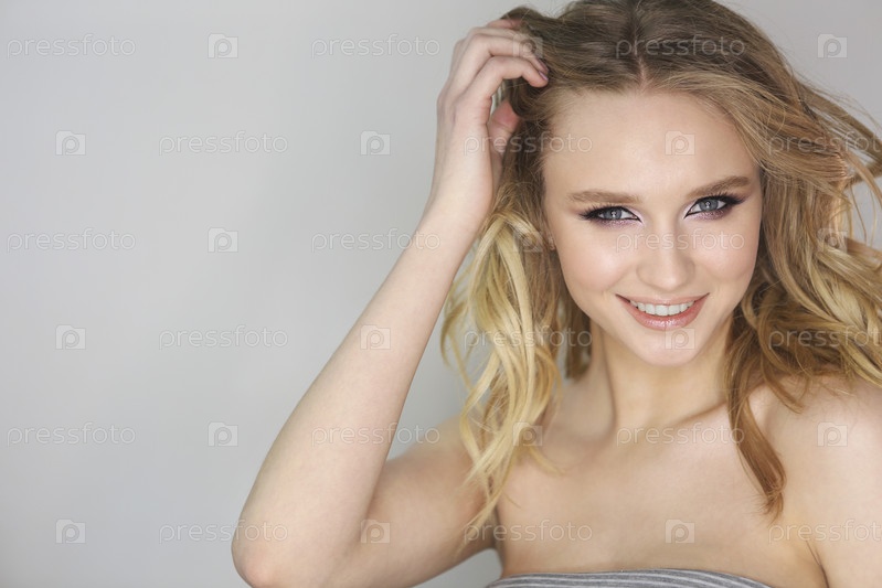 Молодая красивая женщина со светлыми вьющимися волосами на сером фоне