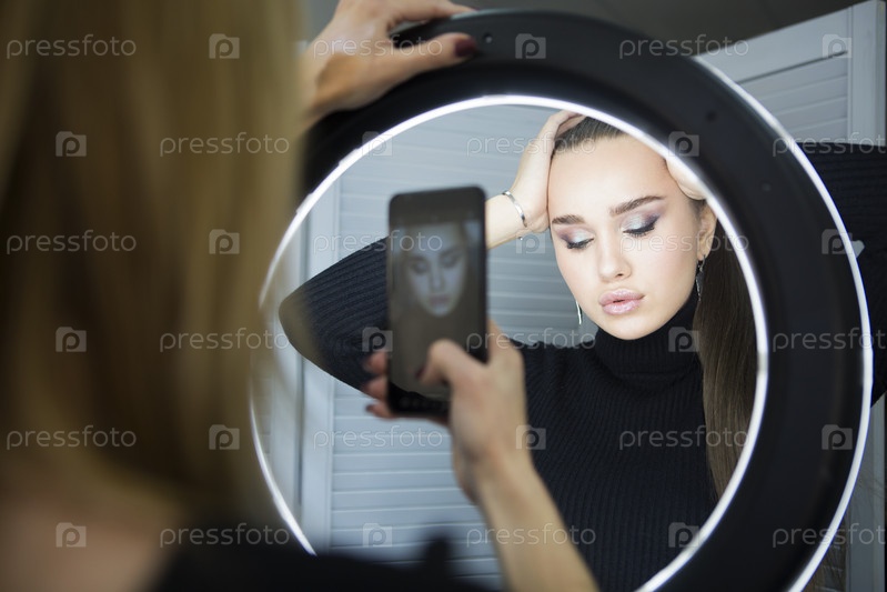Визажист делает мобильное фото для модели