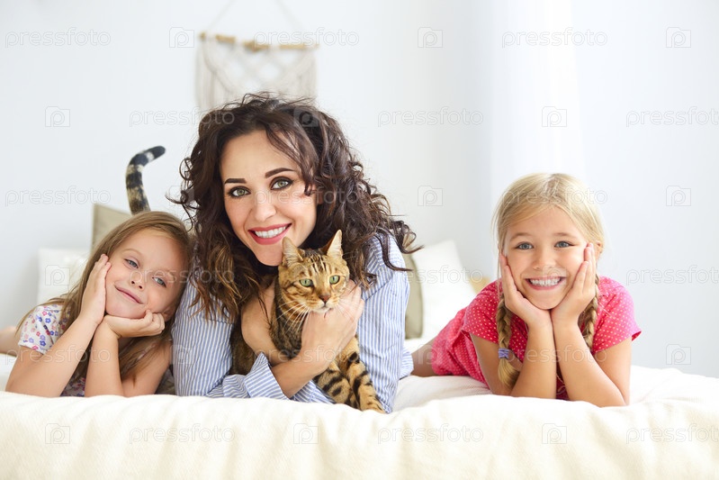 Счастливая семья в домашнем интерьере с кошкой