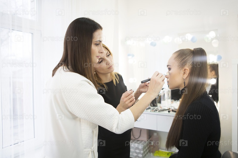 Учитель макияжа со своей ученицей. Урок макияжа в школе красоты. Визажист работает в своей студии
