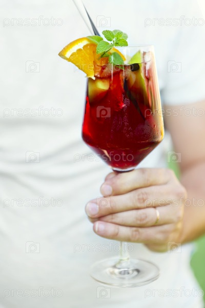 Стакан ледяной сангрии с клубникой, апельсином, яблоком и лимоном в руке мужчины