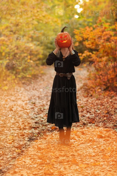 Молодая ведьма с фонарем Джека в лесу