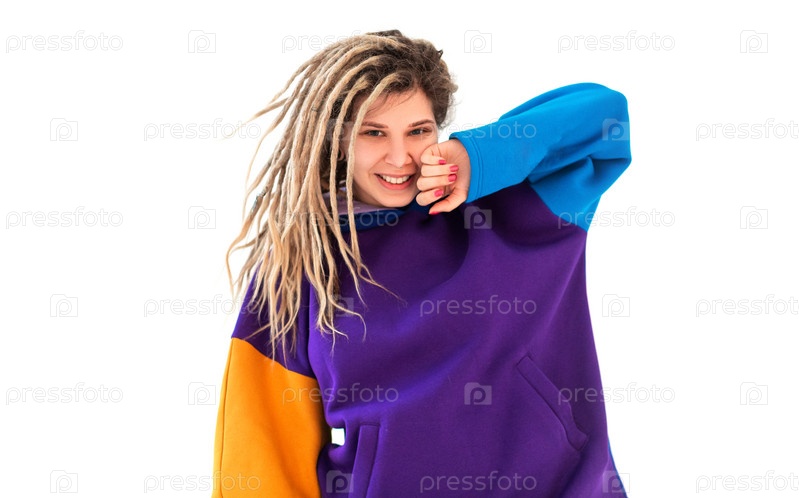 Счастливая женщина трясет дредами и улыбается